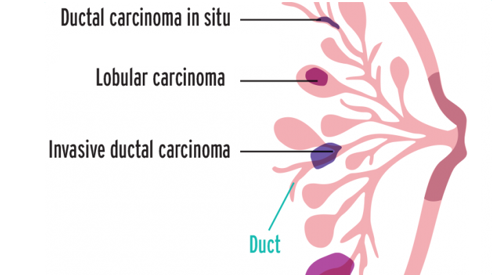 The type of breast cancer depends on which part of the breast the cancer originated. This could be the milk ducts, the milk-producing lobules, the connective tissues etc.